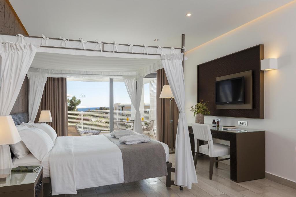 Elke kamer in prinses Andriana is uitgerust met modern comfort, met gratis Wi-Fi-toegang, satelliet LCD-tv's, mini-bars en beveiligde kluizen. De accommodaties variëren in termen van uitzicht, variërend van prachtige zeevista's tot serene instellingen voor het zwembad. Kinderen zullen genieten van de toegewijde kinderclub, waar ze kunnen deelnemen aan leuke activiteiten en spelletjes die worden begeleid door ervaren personeelsleden.