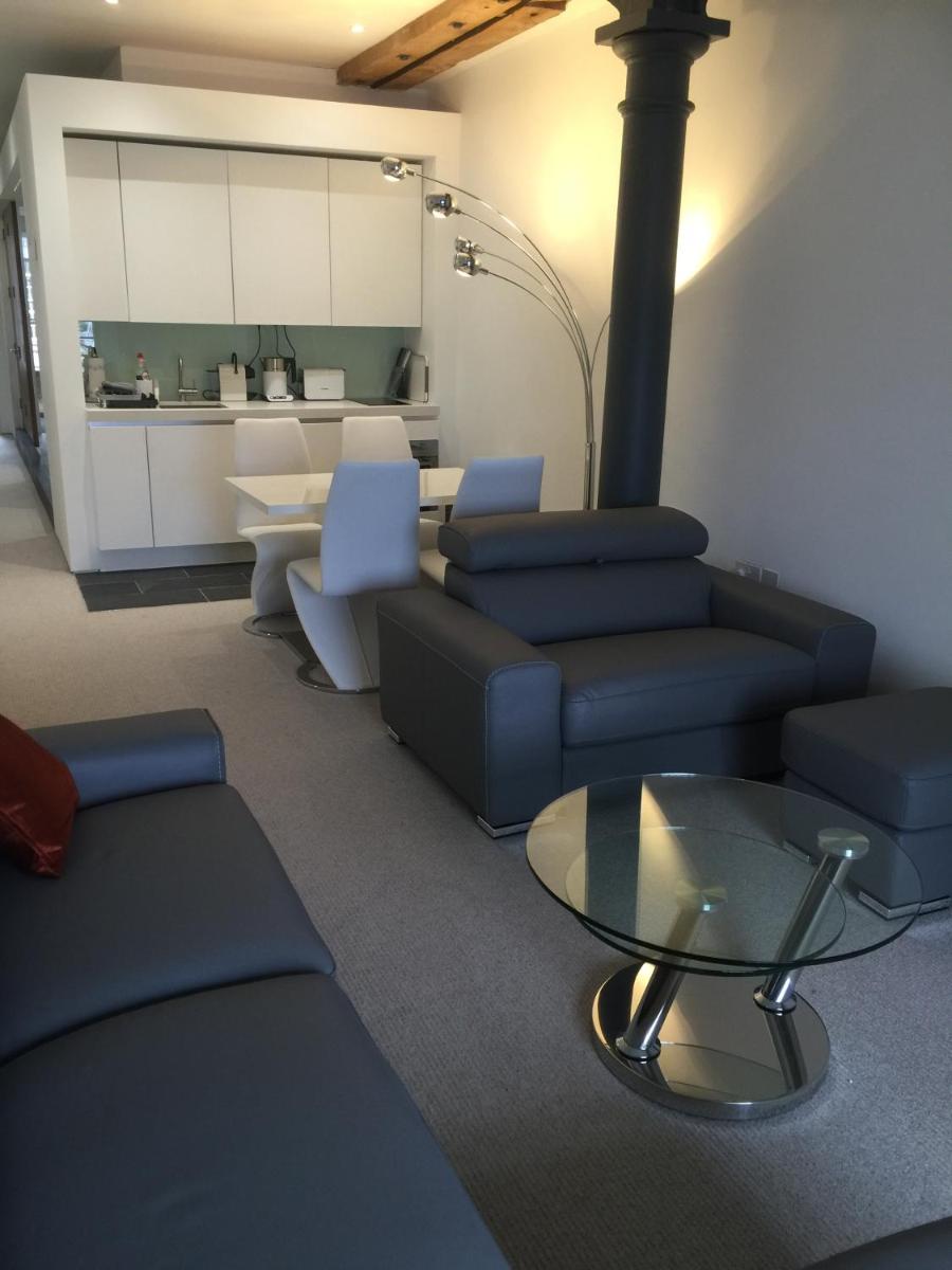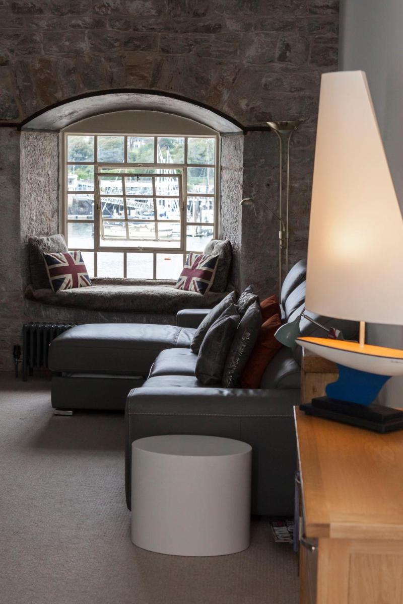 Mayflower Apartments, Royal William Yard, de historische waterkant van Plymouth, beschikt over appartementen in hedendaagse stijl met zowel historische charme als moderne gemakken. Deze accommodaties zetten de pittoreske haven op en combineren traditionele architecturale elementen naadloos met ultramoderne voorzieningen. Elk appartement heeft een gezellige zit- en eethoek uitgerust met een grijze lederen slaapbank en eigentijdse eettafel en stoelen. Flatscreen-tv's, surround sound-systemen en Bluetooth-muziekspelers verbeteren het verblijf, waardoor gasten hun ervaring kunnen personaliseren met aanpasbare verlichtingsopties.