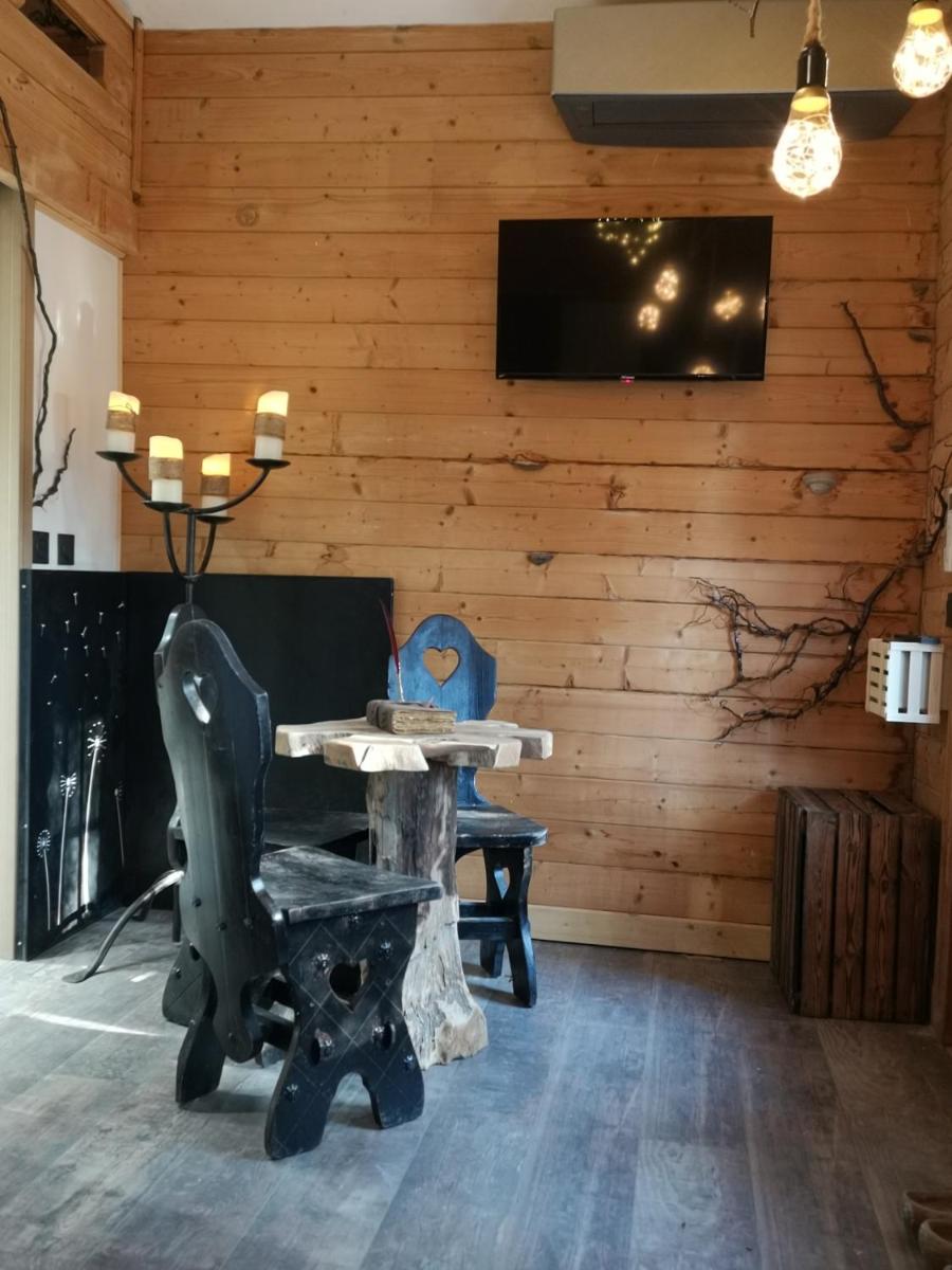 De hut is omgeven door de bomen en prachtig ingericht.