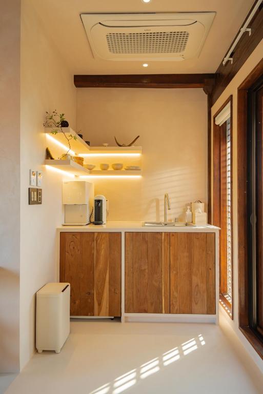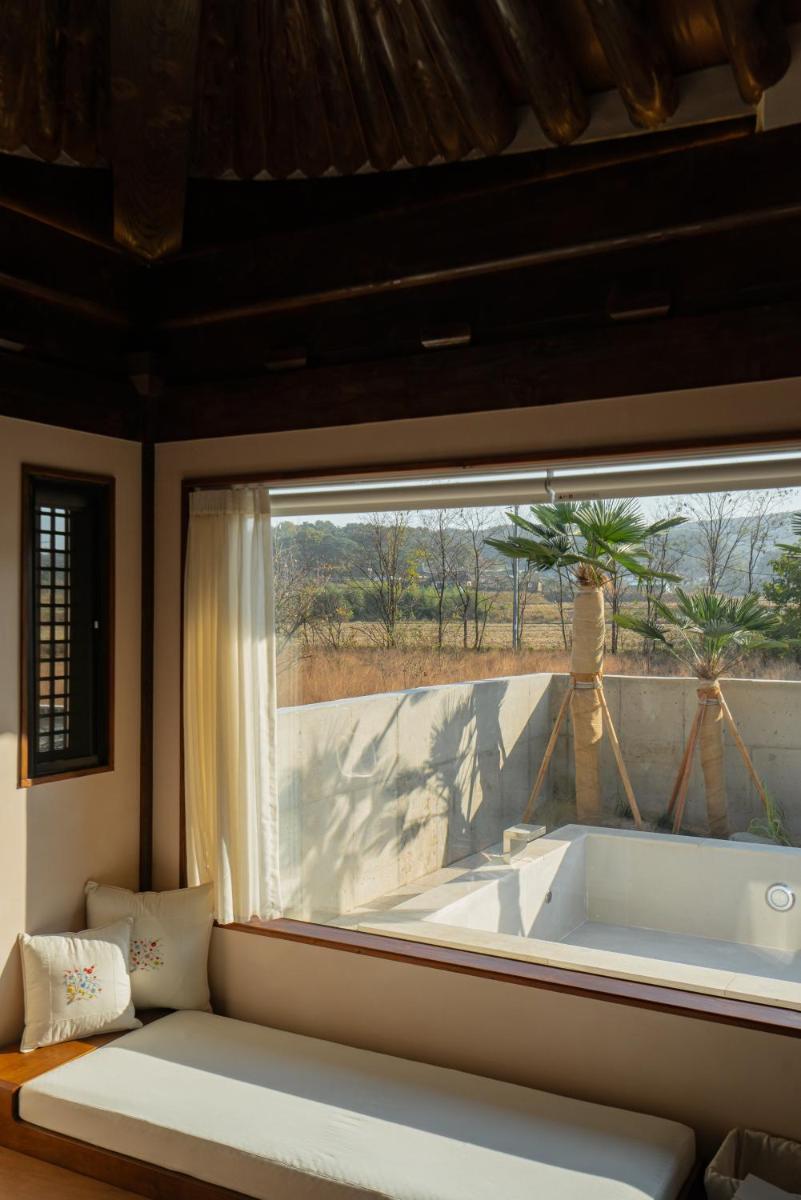 Blijf O'on in Gyeongju, met berguitzicht, een openluchtbad en een weelderige tuin, presenteert een charmante retraite met privéfaciliteiten, waaronder een privézwembad, gratis wifi en beveiligde privéparkeren. Elke ruime eenheid heeft een volledig uitgeruste kitchenette, uitgerust met voorzieningen zoals een eetgedeelte, een magnetron, een koffiezetapparaat en een koelkast. Elke slaapkamer wordt compleet geleverd met een eigen badkamer met een bidet, samen met gewaden, slippers en een haardroger, die comfort en gemak zorgt.