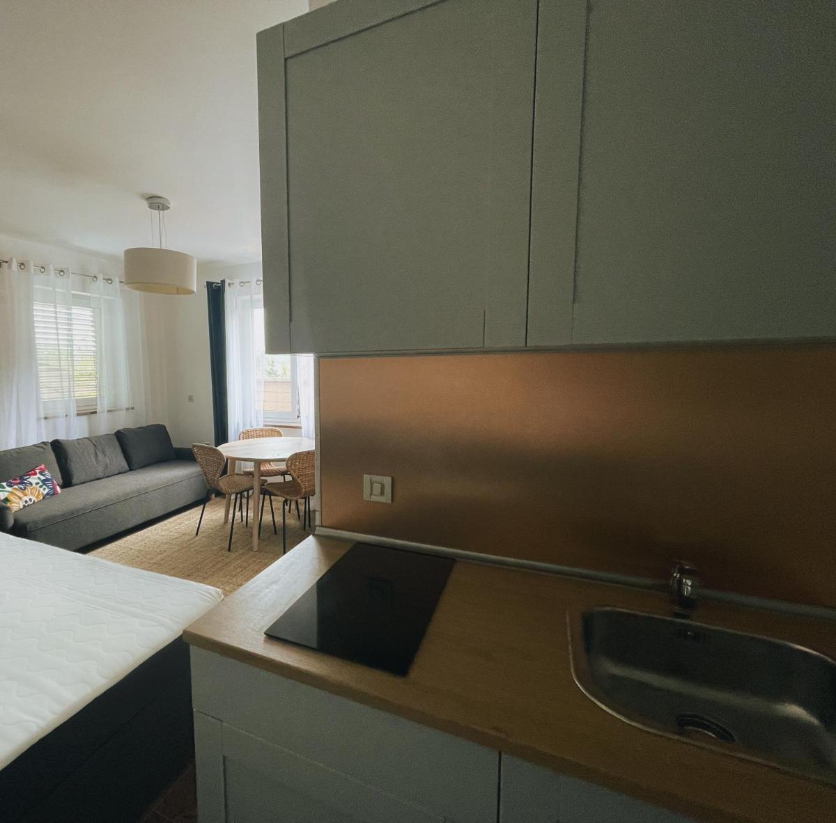 Het appartement is uitgerust met moderne gemakken en beschikt over een ruime patio en tuin, perfect om na een dagje verkenning te ontspannen. De woonruimte omvat een comfortabele zithoek waar bezoekers kunnen ontspannen en tot rust kunnen komen. Het appartement beschikt over een volledig uitgeruste keuken, compleet met essentiële apparaten zoals een vaatwasser en magnetron, waardoor gastheren zonder veel gedoe kunnen heerlijke maaltijden kunnen bereiden.